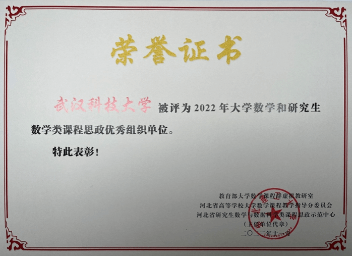 3003新葡的京集团被评为2022年大学数学和研究生数学类课程思政优秀组织单位,新葡的京官网教师蒋君被评为大学数学和研究生类课程思政教学名师;龚谊承获得大学数学和研究生数学类课程思政教学优秀案例特等奖,蒋君、李春丽、张青、张学英获得一等奖,咸艳霞获得二等奖。