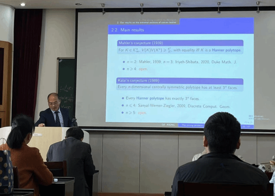 熊革教授在这次报告中,首先介绍了著名的Bourgain切片问题和径向常数猜想与超平面截面猜想的等价关系,然后介绍了他们团队关于凸体极值截面问题的最新进展。