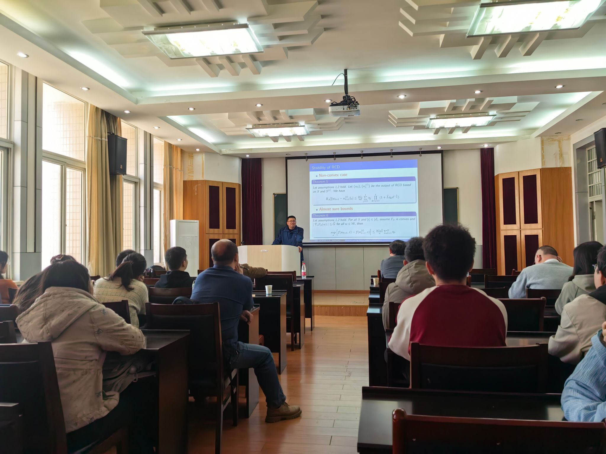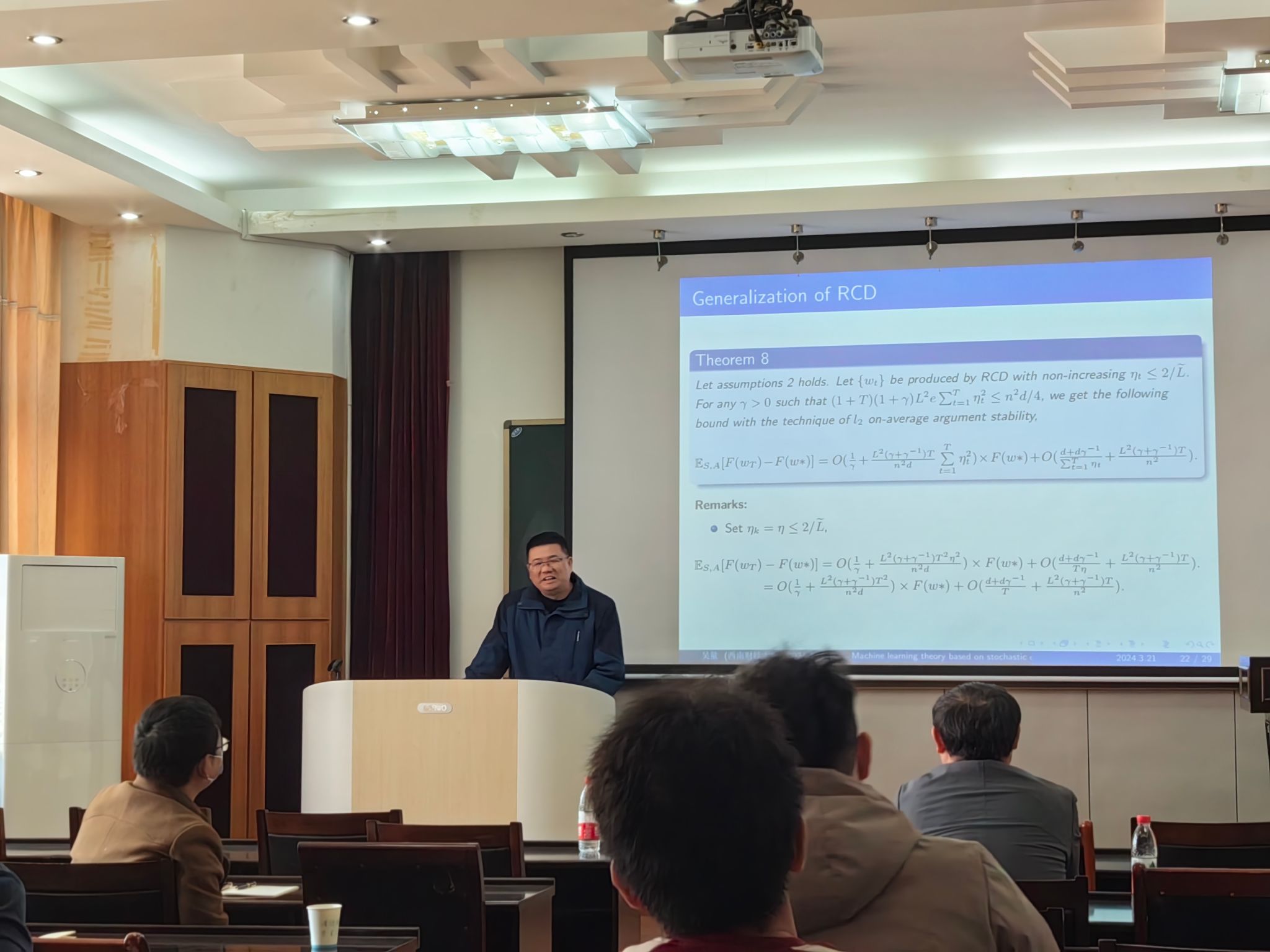 在本次报告中,吴量副教授首先介绍了基于随机算法的机器学习理论中的一些基本问题,主要包括泛化误差及其分解,并进一步介绍了基于随机坐标下降算法(RCD)的泛化误差理论。吴量副教授首次使用RCD 算法的稳定性这一强大的工具分析了RCD 算法的泛化误差性质,这种理论分析方法通过权衡估计和优化来获得最优的迭代步数,随后将理论应用于实际,通过实验说明了RCD 算法在稳定性方面的优势。