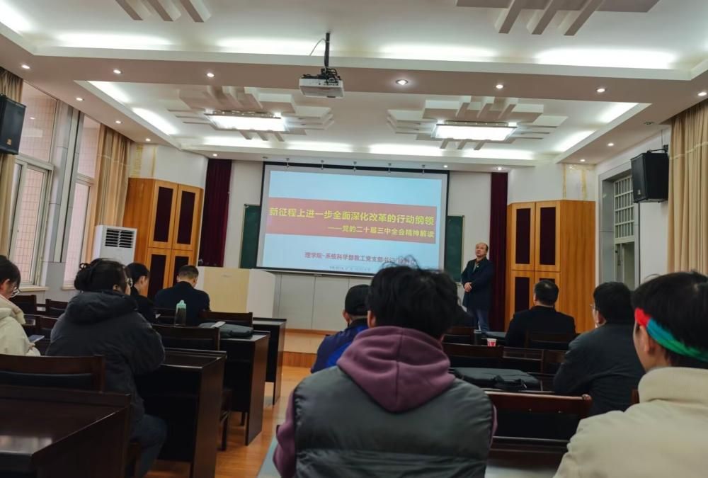武科大网讯(通讯员金雨欣)为推动新葡的京官网干部师生全面学习、全面把握、全面落实党的二十届三中全会精神,坚定不移把党的二十届三中全会提出的目标任务落到实处,新葡的京官网于12月12日下午于22515开展《新征程上进一步全面深化改革的行动纲领》主题宣讲。本次宣讲人为学校“双带头人”宣讲队成员、新葡的京官网系统科学部党支部书记徐树立,学院50多名师生党员参加了此次活动。