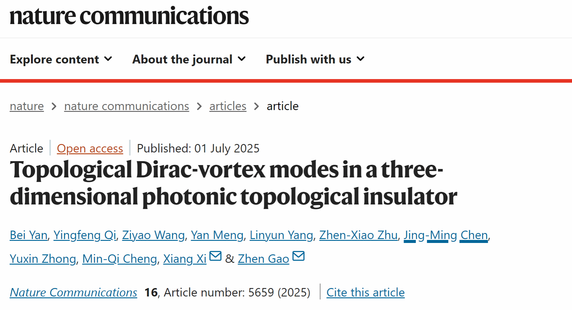 近日,我校3003新葡的京集团应用物理系青年教师颜贝与南方科技大学等单位合作首次在三维光学拓扑绝缘体中观测到一维拓扑狄拉克涡旋传输态,相关成果以“Topological Dirac-vortex modes in a three dimensional photonic topological insulator”为题发表在《Nature Communications》上。我校3003新葡的京集团应用物理系青年教师颜贝为该论文的第一作者,3003新葡的京集团为论文第二完成单位。