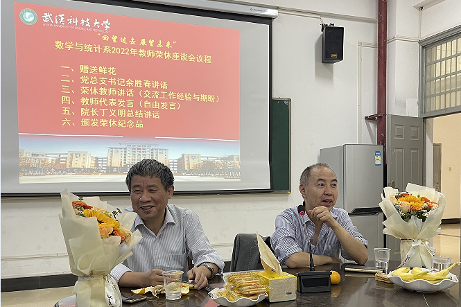 会上,院长丁义明对两位教授工作中做出的贡献和取得的业绩给与充分肯定,并表达了崇敬与感激之情,还用“传承”二字对数学与统计系全体教师寄予期望,期望大家将两位教授艰苦奋斗、不懈努力的工作作风和优良品质“传承”下去,期望大家精诚团结、开拓进取,将数学与统计系建设和发展得更好!