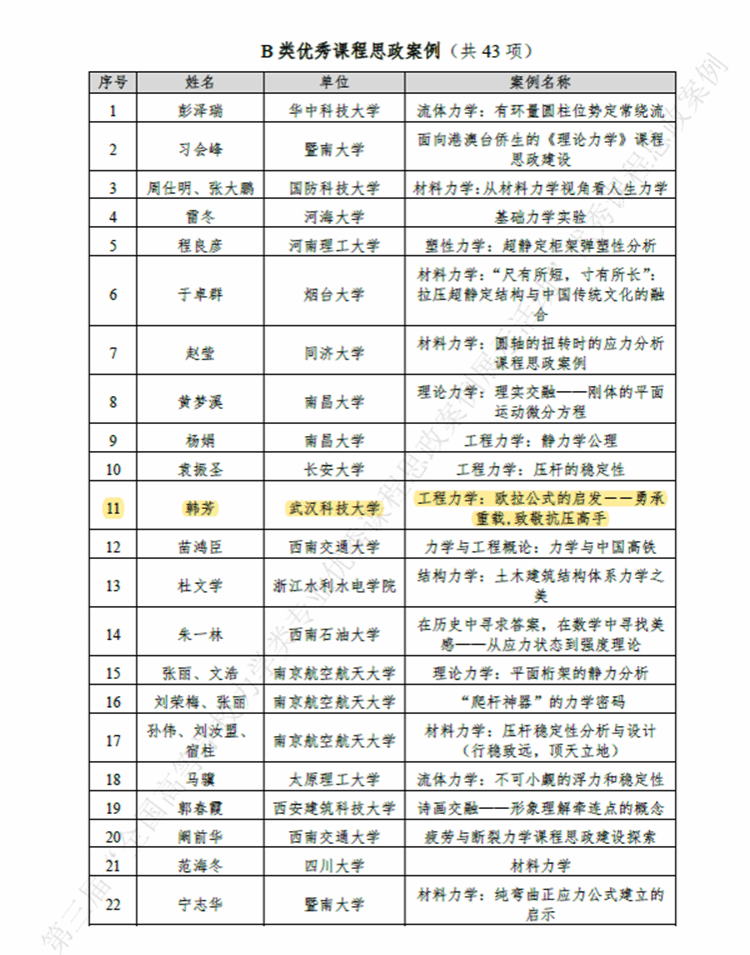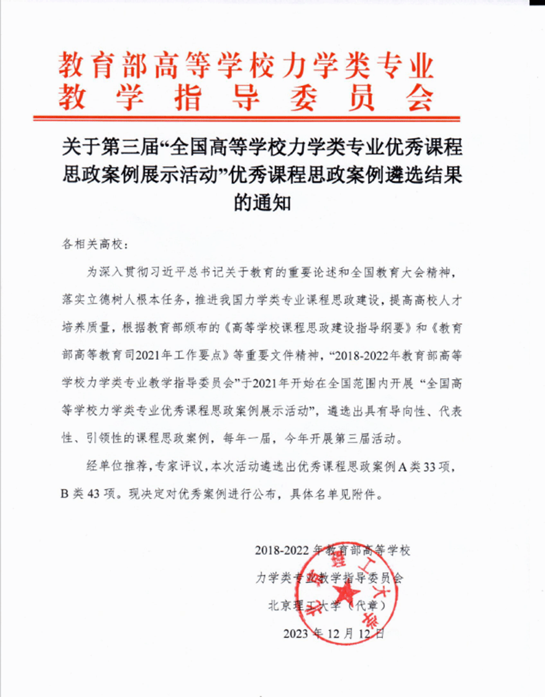 工程力学系课程思政案例入选全国高等学校力学类专业优秀课程思政案例