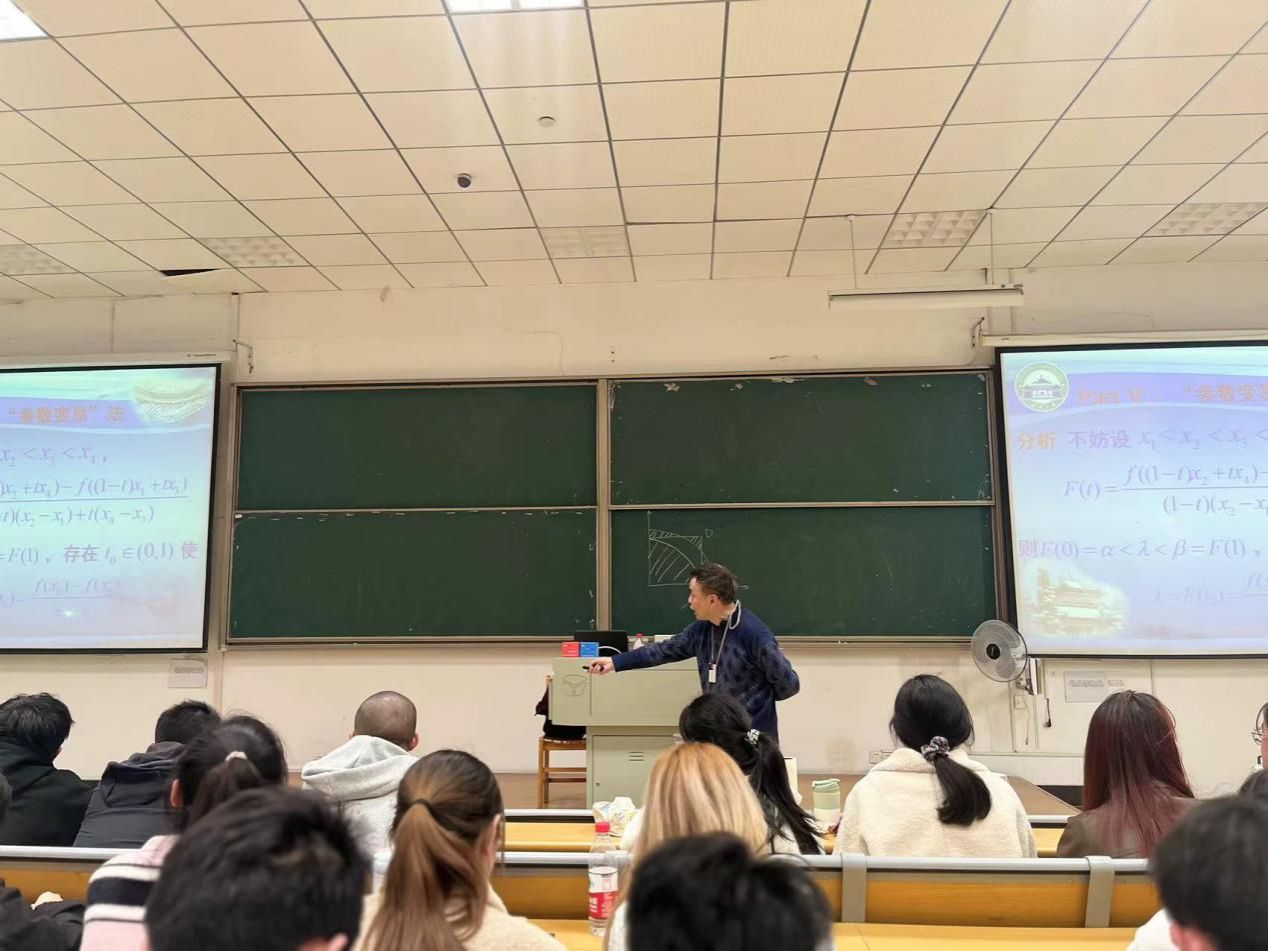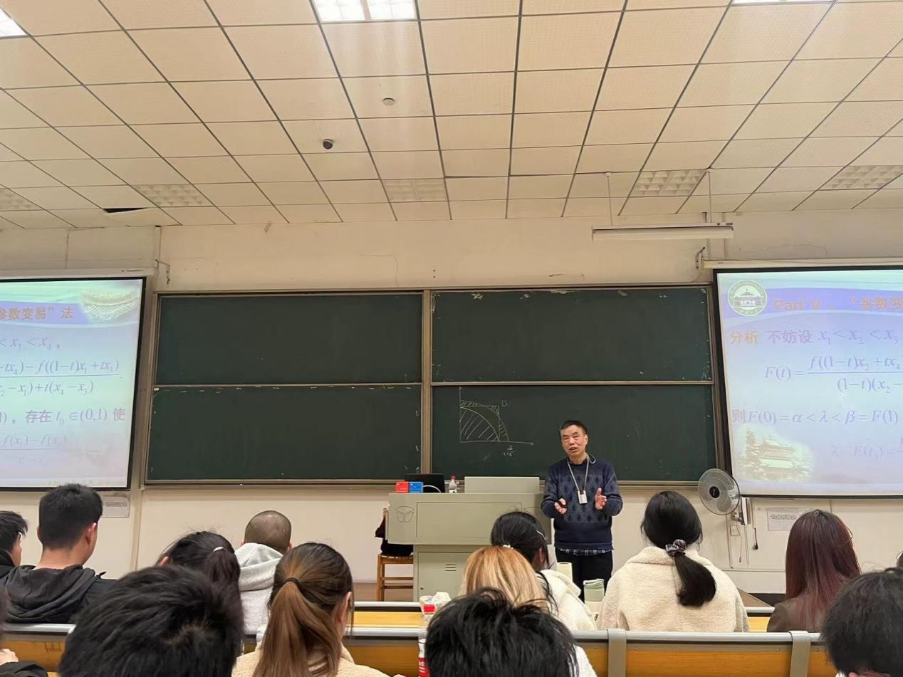 在樊教授的指引下,现场学生逐步掌握了多种解题技法。几何直观法,将题目所给条件用画图使其直观化,可以让原本无从下手的问题变得目标清晰;维数调整法,将多维问题转化为一维来解答,将一维问题转变为多维问题,重要的是转化为最直观的表达;参数变易法,将原先的未知数改造成新的参数,函数不等式即可得到简化,问题也迎刃而解。