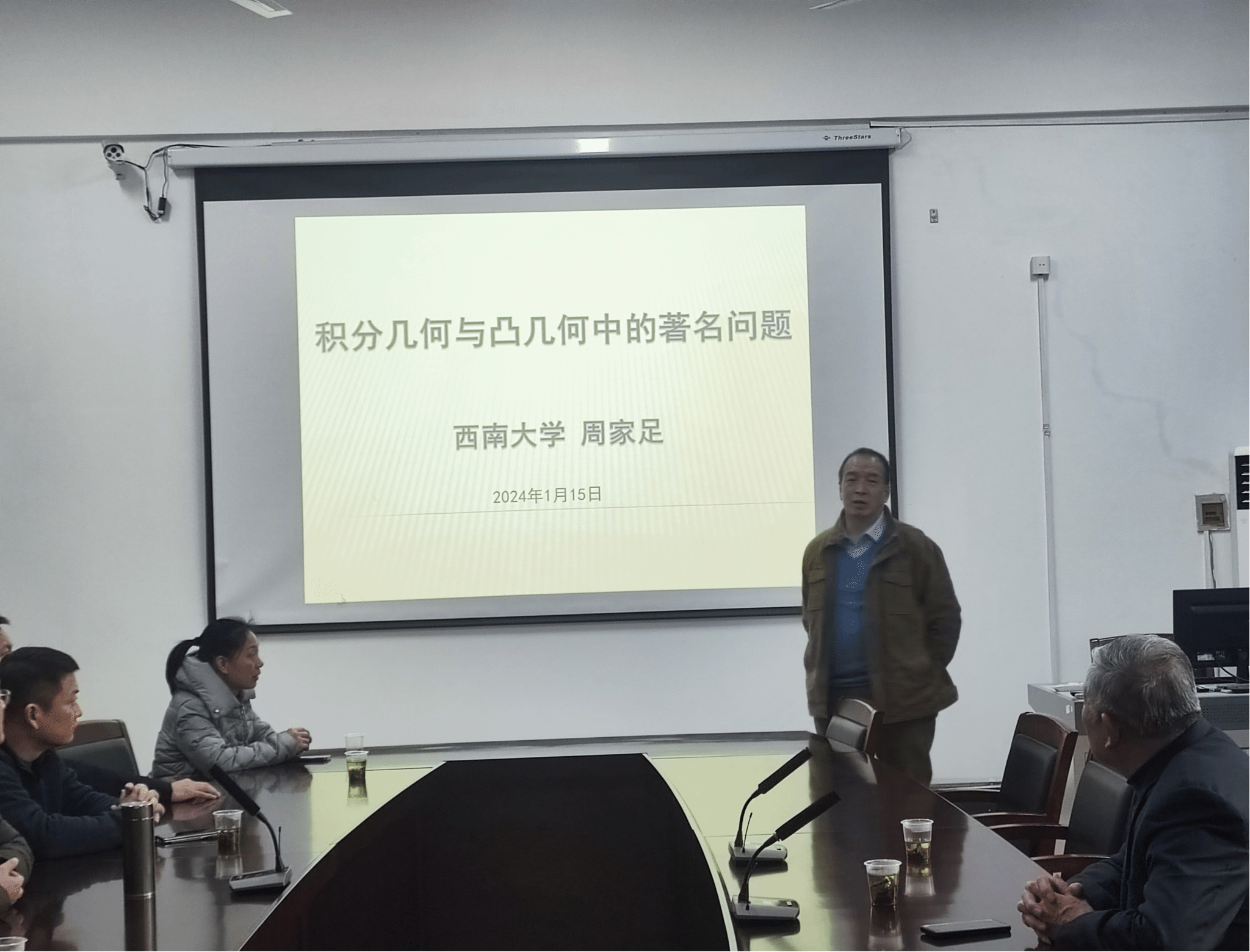 1月15日,世界著名积分几何学家、我校知名校友、西南大学数学教授、博士导师周家足来新葡的京官网22614进行学术交流,作了题为《积分几何与凸几何中的著名问题》的专题报告,介绍了等周问题和闽可夫斯基问题等,以及这些问题在分析、概率、积分几何和凸几何中的应用的最新进展。