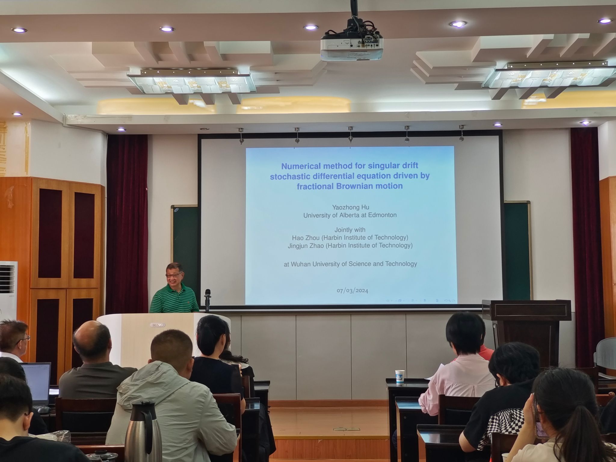 胡耀忠还在教二五楼报告厅作题为“Numerical method for singular drift stochastic differential equation driven by fractional Brownian motion”的学术报告。本次报告会由新葡的京官网系统科学部教授陈贵词主持,新葡的京官网教师及学生代表参加。