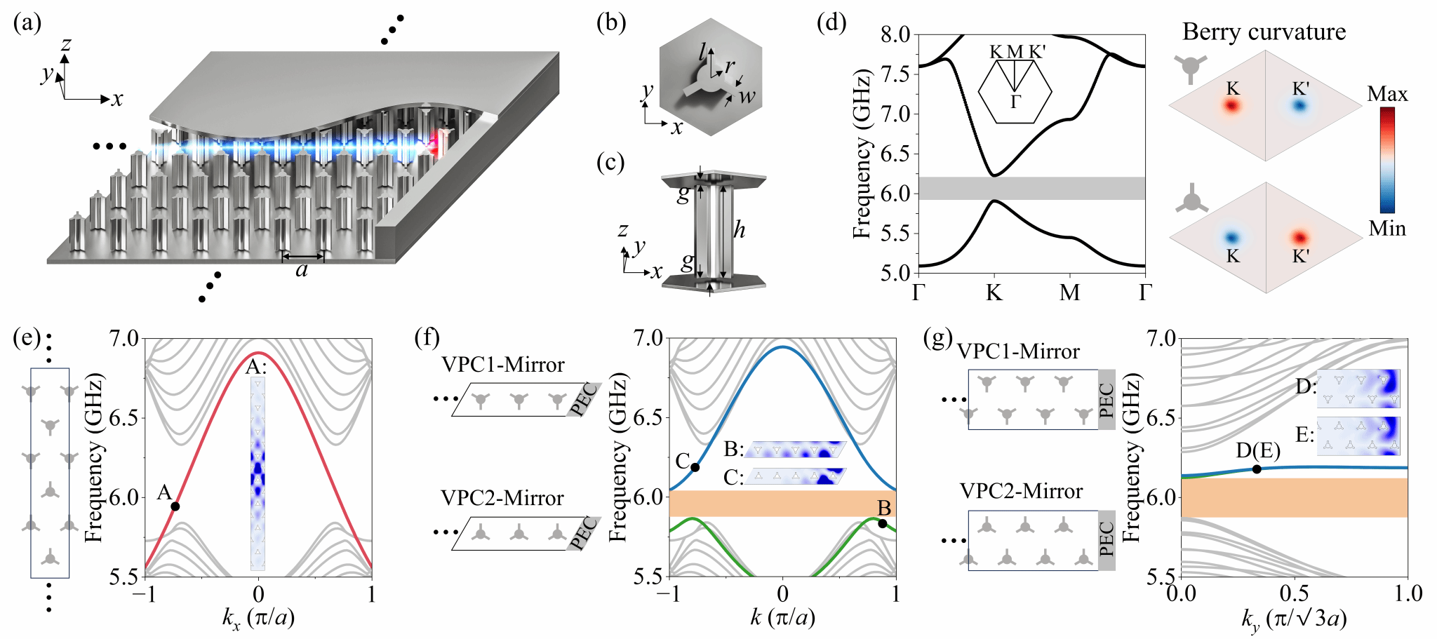 为了实现此拓扑控制光子腔,该研究团队在VPC波导的终端放置完美电导体(Perfect electric conductor,PEC)反射镜,如图1(a)和图1(f)-1(g)所示。当向右传播的谷边界态遇到PEC时,它有三个不同的散射通道,即VPC1-PEC界面、VPC2-PEC界面和VPC波导。根据PEC反射镜的方向,可考虑了两种类型:锯齿形[图1(f)]和扶手形[图1(g)]。图1(f)[图1(g)]显示了锯齿形(扶手形)终端所对应的超胞结构的色散,绿(蓝)线表示由VPC1-PEC界面(VPC2 -PEC界面)支持的平庸界面态的色散,且平庸态存在带隙 [图1(f)-1(g)中的橙色区域],这表明在平庸界面态的带隙内的谷偏振边界态遇到PEC反射镜时,它不能通过上下VPC-PEC通道泄漏。最后一个散射通道是后向散射,需要拓扑边界态的谷指数从K反转到K'。因此,谷翻转率等于拓扑控制光子腔的泄漏速率。有趣的是,已有研究表明,谷翻转率取决于微扰的拓扑结构,而锯齿形放置PEC由于谷守恒可以显著抑制谷间散射。相反,扶手形放置PEC具有更高的谷翻转率。因此,以锯齿形方向放置PEC于 VPC波导终端,使谷翻转率最小化,同时谷边界态紧密局域于PEC镜面表面,形成亚波长拓扑控制光子腔。
