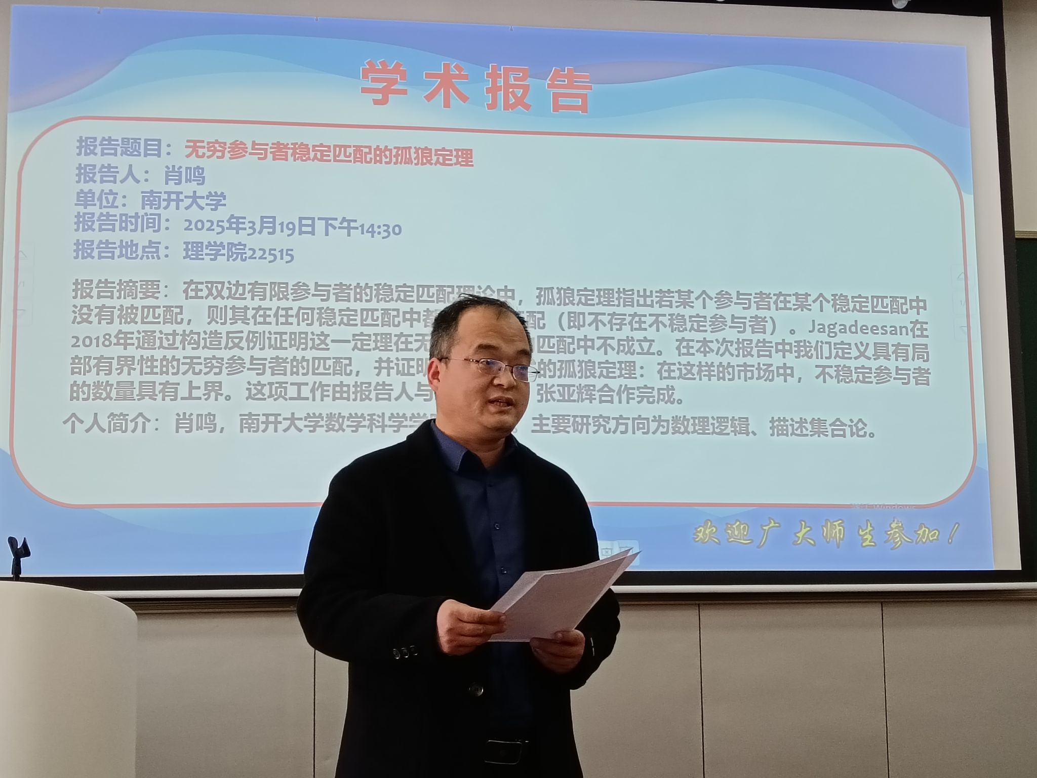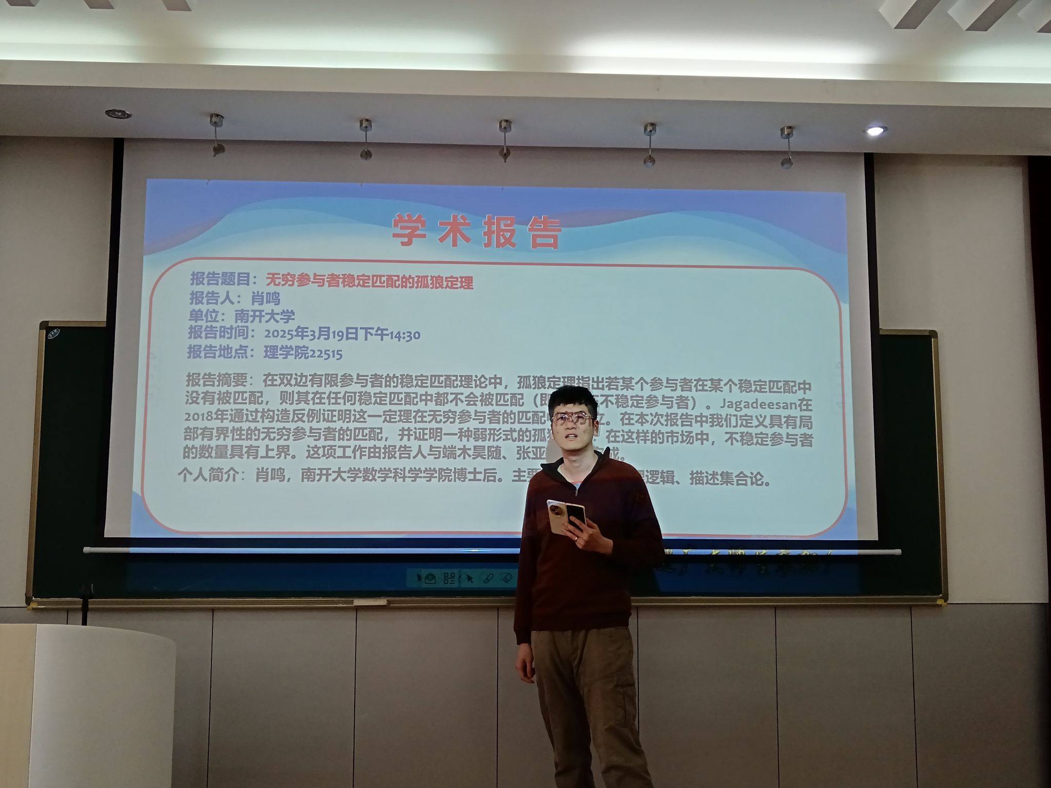 肖博士在报告中深入浅出地阐述了其与合作者在无穷多参与者的稳定匹配模型中的孤狼定理的新进展。他首先对问题的背景进行了全面而细致的讲解,随后详细叙述了在无穷多参与者情形下的一种弱形式的孤狼定理,并给出了严谨的证明过程,让在场师生对这一前沿研究成果有了清晰的认识。