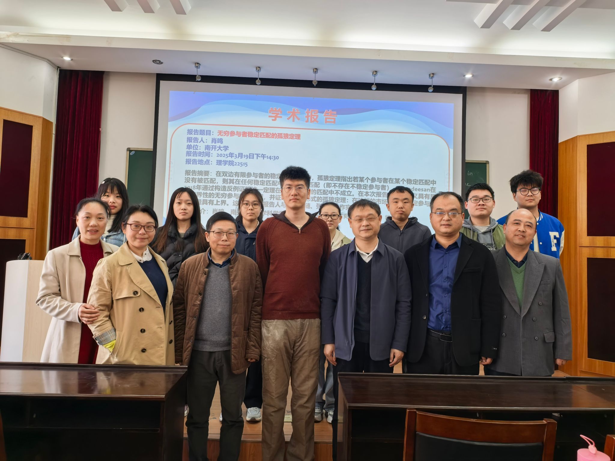 与会师生纷纷表示,通过此次报告会,他们对无穷参与者稳定匹配的孤狼定理有了全新的认识和理解,也深刻感受到了数学与经济学交叉领域研究的魅力与挑战。