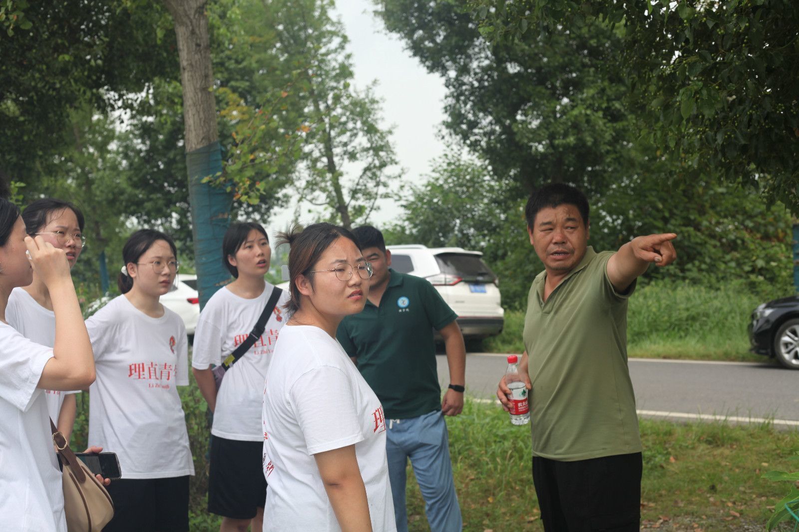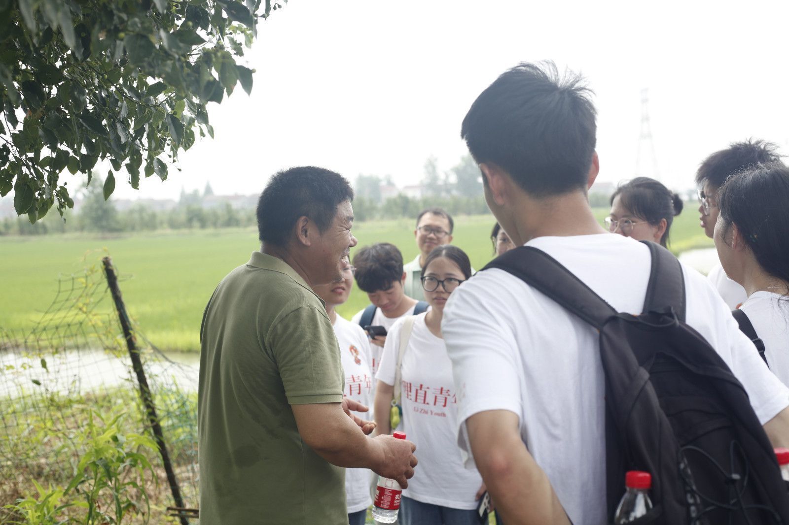 在农场主肖诗兵的带领下,实践队成员前往了稻田实地观察。在看过虾稻共生的环境后,实践队成员向肖诗兵进行提问,以了解肖诗兵为何选择这样种植。“水沟里养的是虾,水沟的深度根据温度变化,温度高时水沟会深一些,防止虾因温度过高死亡,温度低时水沟会浅一些,节约成本。这个水我们每十天就会更换一次,以保证水质干净。”肖诗兵向实践队员们解释道。