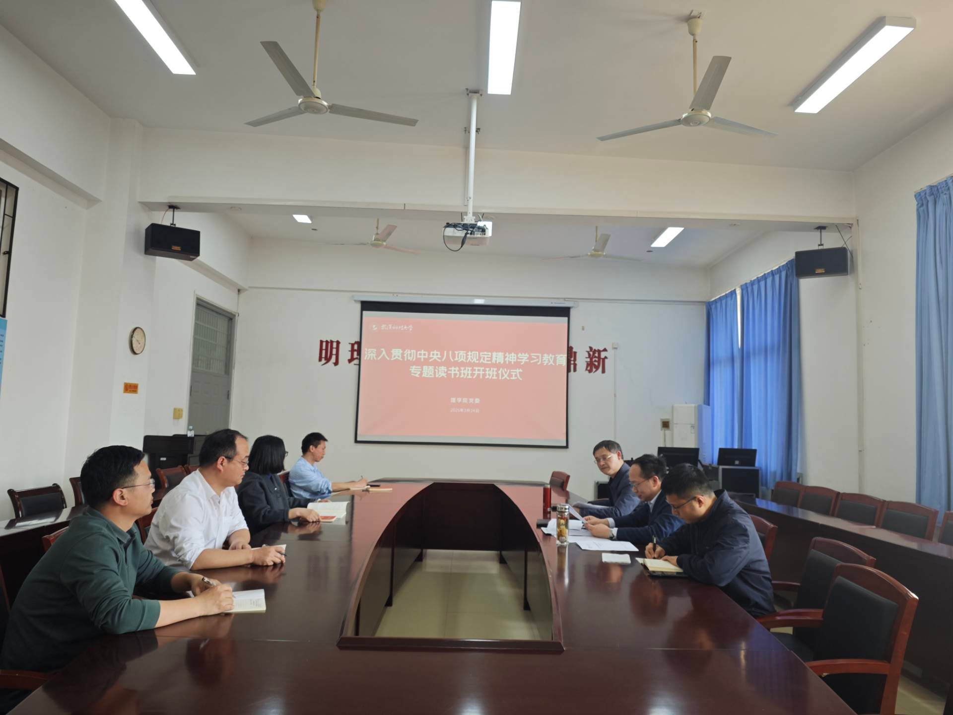 3月24日,理学院党委召开会议,安排部署深入贯彻中央八项规定精神学习教育和专题读书班。会议传达了中央和省委关于深入贯彻中央八项规定精神学习教育的相关文件和会议精神及学校党委关于部署深入贯彻中央八项规定精神学习教育的相关要求,审议了《理学院深入贯彻中央八项规定精神学习教育实施方案》《理学院深入贯彻中央八项规定精神学习教育领导干部专题读书班安排》。学院党委书记王文涛作动员讲话,学院党委领导班子成员参加会议。